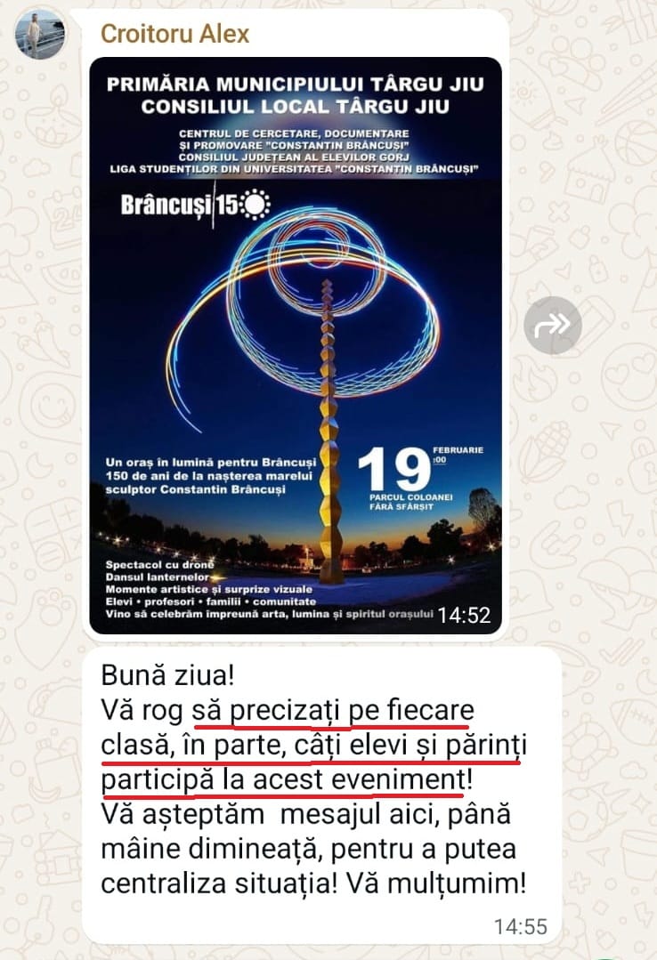 Scandal în unitățile de învățământ din Târgu Jiu, cu doar câteva zile înainte de Ziua Națională Brâncuși. Potrivit informațiilor apărute în spațiul public, directorii de școli și licee ar fi obligați să prezinte primarului Marcel Romanescu situația exactă, pe clase, cu elevii și părinții care vor participa la manifestarea organizată de Primăria Târgu Jiu în Parcul Coloanei Infinite.